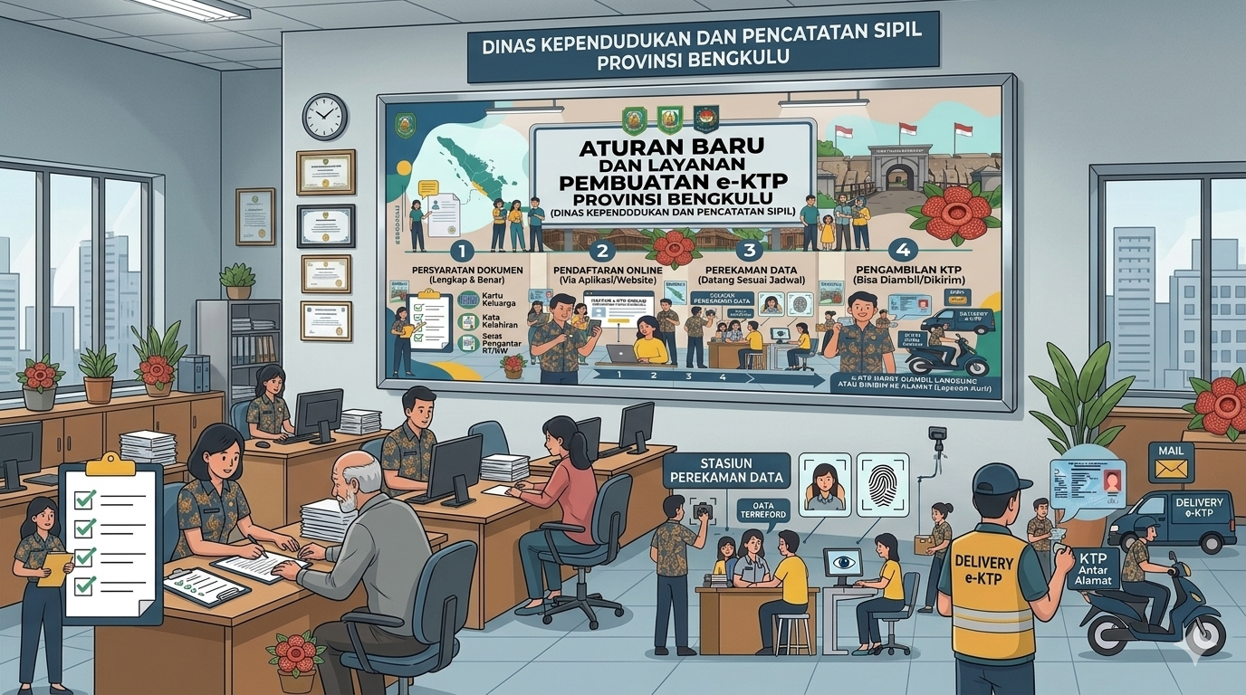 SAHABAT RAKYAT, Bengkulu – Pemerintah Kota (Pemkot) Bengkulu, Provinsi Bengkulu, menegaskan bahwa masyarakat yang mengurus dokumen kependudukan, seperti nama pada kartu tanda penduduk elektronik (KTP-el) maupun kartu keluarga (KK), wajib menggunakan nama minimal dua suku kata dan maksimal 60 karakter, termasuk spasi.