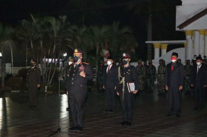 BENGKULU, sahabatrakyat.com– Tepat pukul 00.00 WIB, Senin dini hari tadi (17/08/2021), Kapolda Bengkulu Irjen Pol. Drs. Guntur Setyanto, M. Si bertindak sebagai inspektur upacara (irup) dalam pelaksanaan kegiatan Apel Kehormatan dan Malam Renungan Suci yang berlangsung di Taman Makam Pahlawan Balai Buntar Kota Bengkulu.