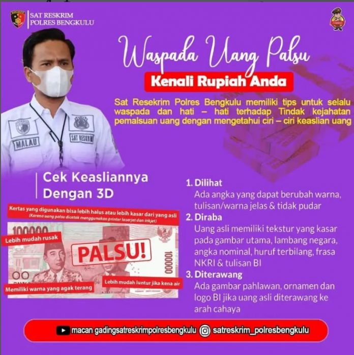 “Kita mengimbau kepada masyarakat untuk memeriksa keaslian uang dengan cara 3D, yaitu Dilihat, Diraba, dan Diterawang,” ujar Kapolres.